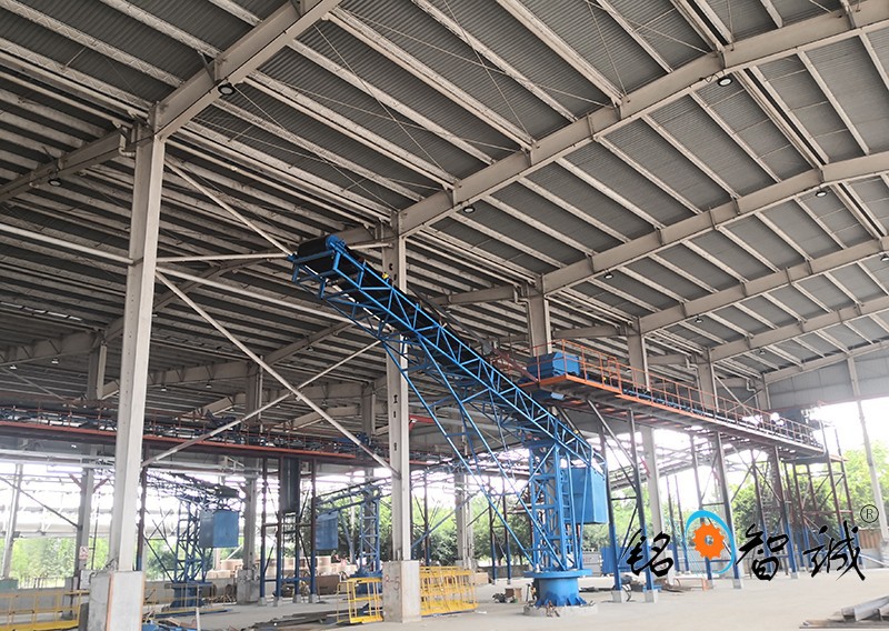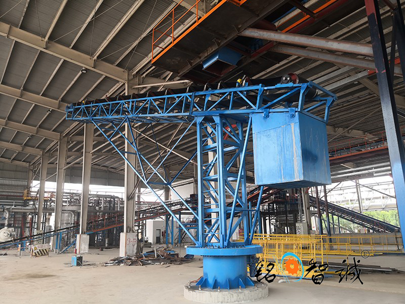 旋轉式皮帶輸送機,為散碎物(wù)料倉貯輸送設備,是在安裝有(yǒu)行走輪的支架上部的底盤上安裝一轉盤,轉盤可相對底(dǐ)盤作旋轉運動,皮帶輸送機的進料端座在轉盤頂部的托盤上,出料端為懸臂式,配重箱(xiāng)在托盤上用以上與懸臂配重,倉貯時,物料通過料鬥由輸送(sòng)帶送至遠端,推動(dòng)懸臂即可改變堆積位(wèi)置,在庫(kù)房(fáng)內實現多點堆積而(ér)勿需停機和移動機體(tǐ),連續作業省時省力,操作方(fāng)便,尤(yóu)其適用於糧食的倉貯輸送(sòng)。
